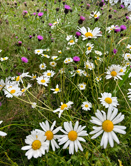 So this year we have observed ox-eye daisies, plantago, red and white campion, wood betony, toadflax, geranium, yellow rattle, rosebay willow herb, tansy, knapweed, meadow cranesbill.
